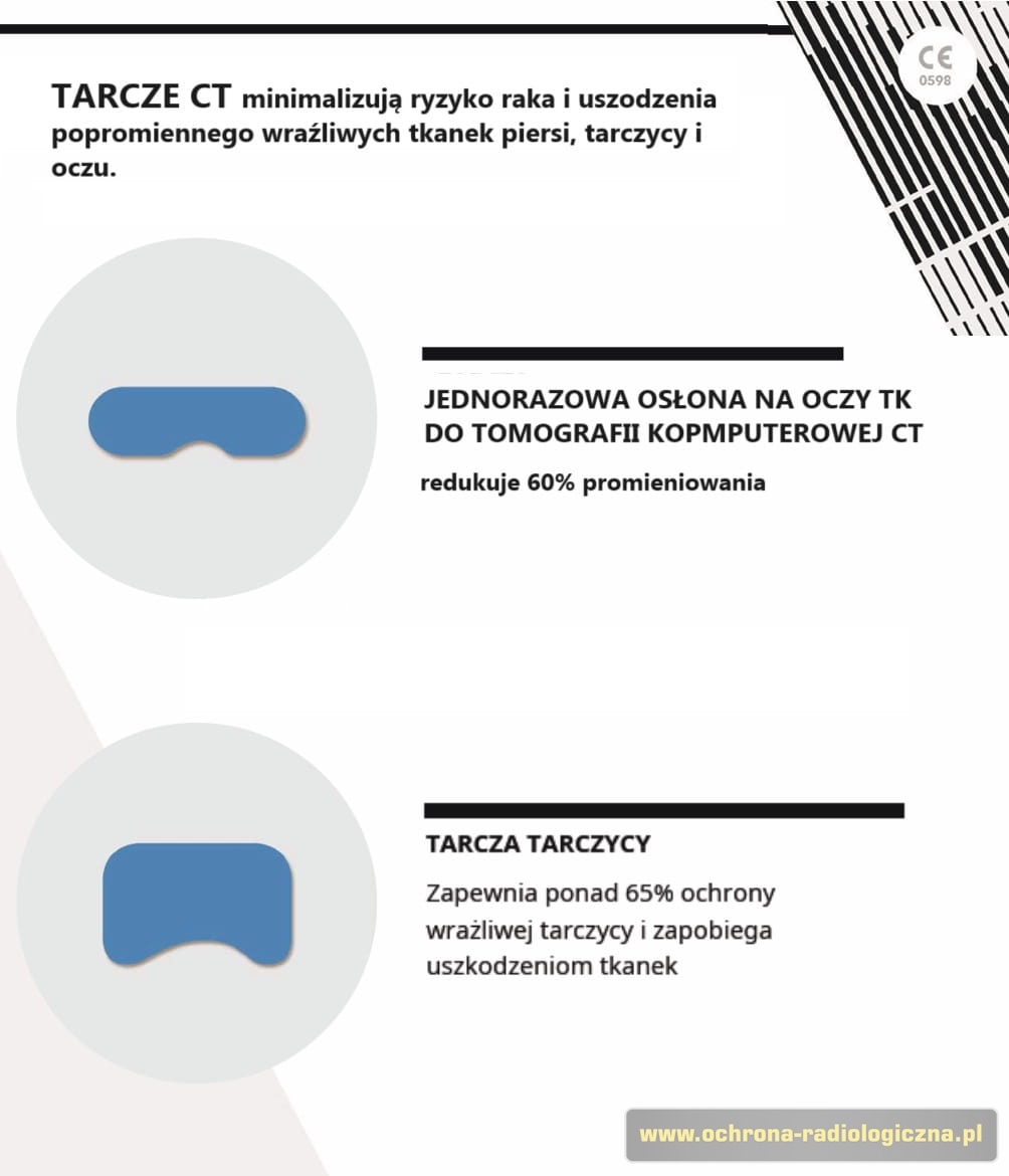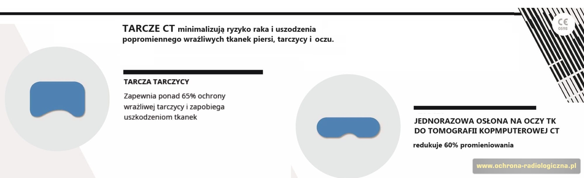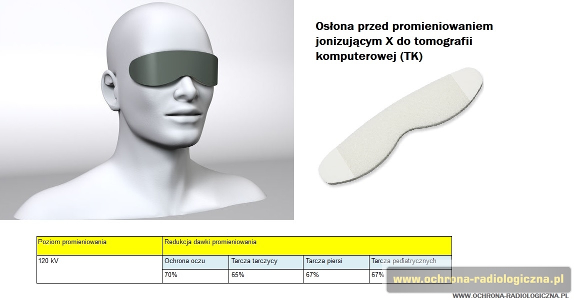Osłona oczu – przeznaczona do ochrony oka, które staje się szczególnie wrażliwe na promieniowanie po wielokrotnych zabiegach tomografii komputerowej. Zapewnia 70% ochronę całego oka. Idealne dopasowanie, aby zapobiec przypadkowemu narażeniu na promieniowanie. Jeden rozmiar pasuje do wszystkich i łatwo go dopasować do kształtu oczu. Jednorazowe i przyjazne dla środowiska.