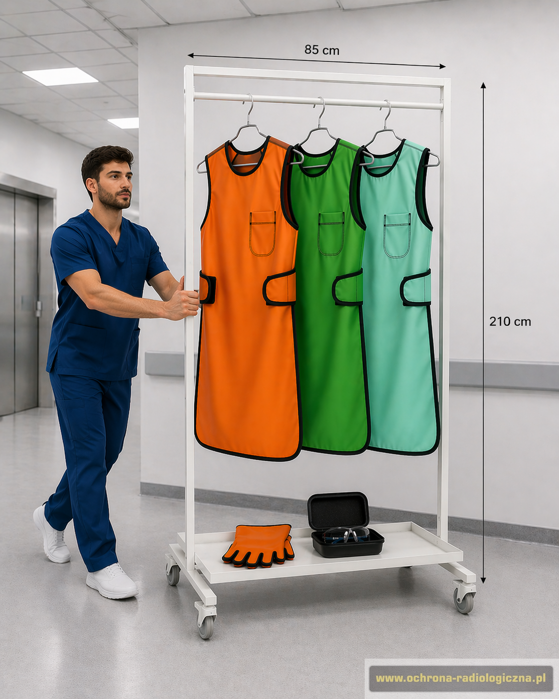 Profesjonalny wieszak przeznaczony do prawidłowego przechowywania odzieży ochronnej stosowanej w pracowniach radiologicznych, gabinetach RTG, salach zabiegowych oraz blokach operacyjnych.